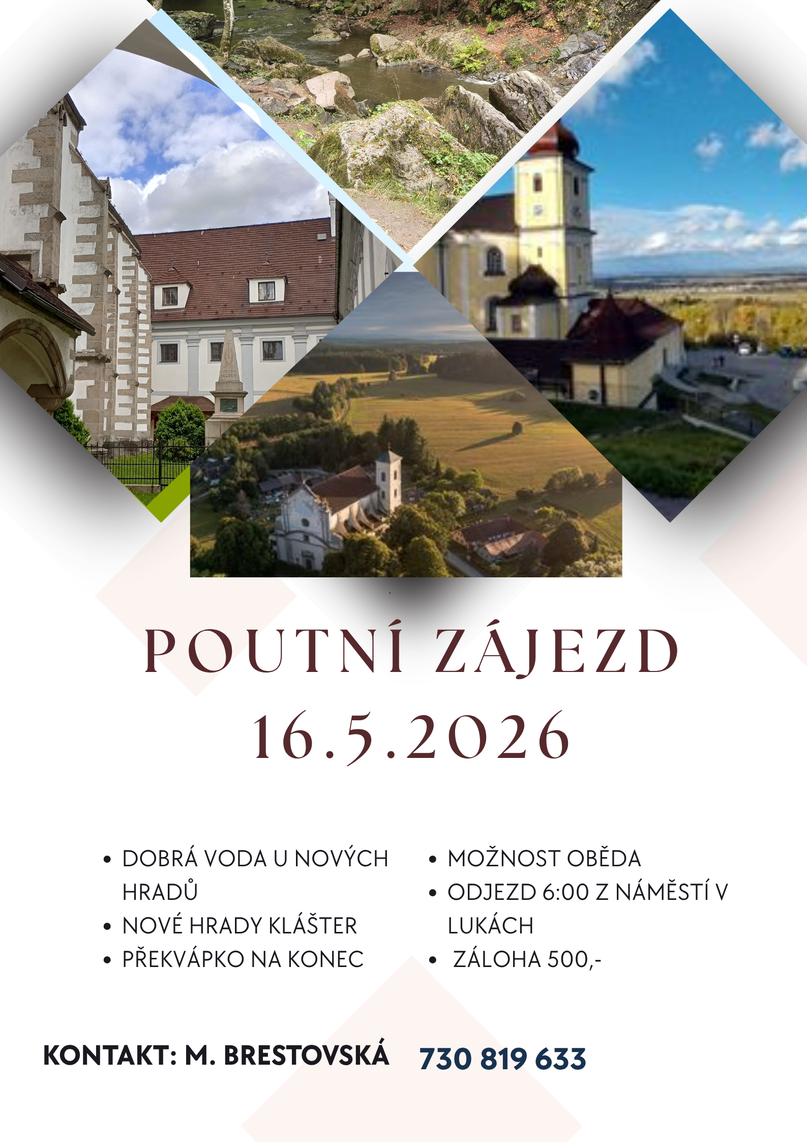 • Srdečně zveme na farní zájezd do Dobré Vody a Nových Hradů, který plánujeme na 16. května. Přihlášky se zálohou 500 Kč přijímá Markéta Brestovská